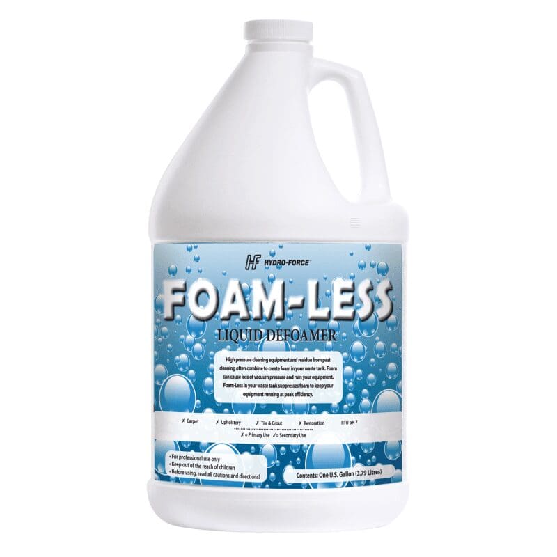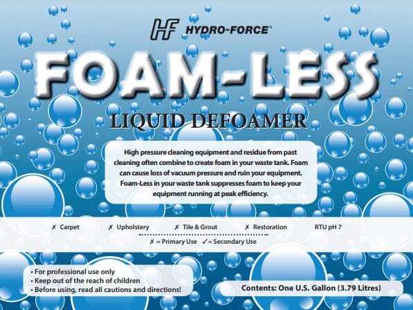 Foam-Less Liquid Defoamer reduces foam caused by detergent left over from previous cleanings (often from a homeowner who doesn’t rinse off the cleaning solutions they use), and when you’re using a high-foaming cleaner. Foam from detergent buildup makes your machine work harder. It can ruin your equipment and cut its cleaning effectiveness. Prevent foam problems by adding Foam-Less through your vac hose or directly into your waste tank. Highly concentrated. Don’t let a little foam slow you down.