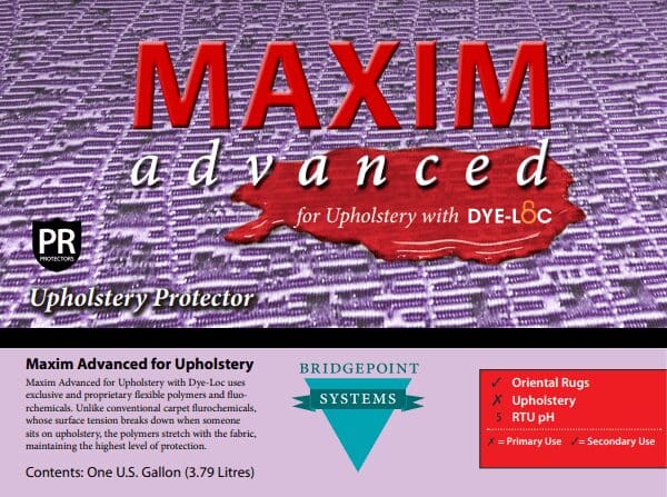 Maxim Advanced for Upholstery will provide your customers with painless spot and spill cleanup. Their upholstery will last longer because this protector reduces wear from abrasive soiling.