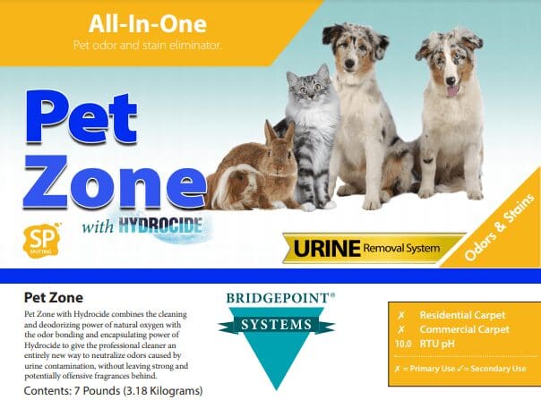 PetZone with Hydrocide combines the cleaning and deodorising power of natural oxygen with the odour bonding and encapsulating power of Hydrocide to give the professional cleaner an entirely new way to neutralise odours caused by urine contamination, without leaving strong and potentially offensive fragrances behind. In addition, the natural oxygen will effectively eliminate stains caused by the urine contamination. This revolutionary formula also includes special additives to enhance solution penetration and improve rinsing and removal. It also contains anti-re-soiling properties that keep the treated area from attracting residue.