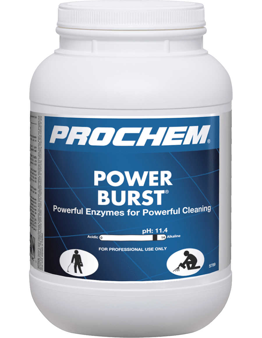 Ultra-concentrated for an economical dilution ratio and the best choice for salvage cleaning of heavily soiled synthetic restaurant carpets! Its advanced triple enzyme technology cuts through meat fats, vegetable oils, grease, grime and protein soils. Compared to the competition’s dilution ratio and pH, Power Burst beats them every time!